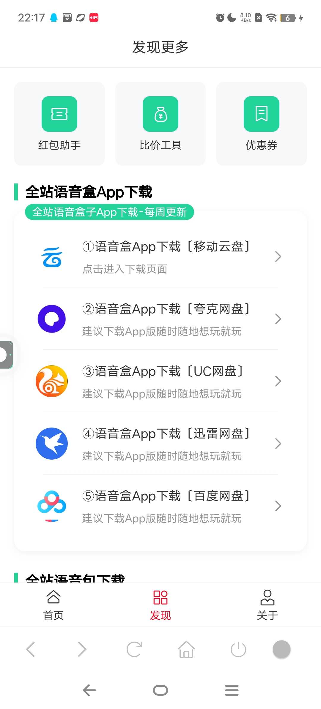这里面包含了所有语音和需要更新版本的查看下面那一栏会发现有一个《发现》的选项里面有好几种下载方式,我是用UC浏览器下的