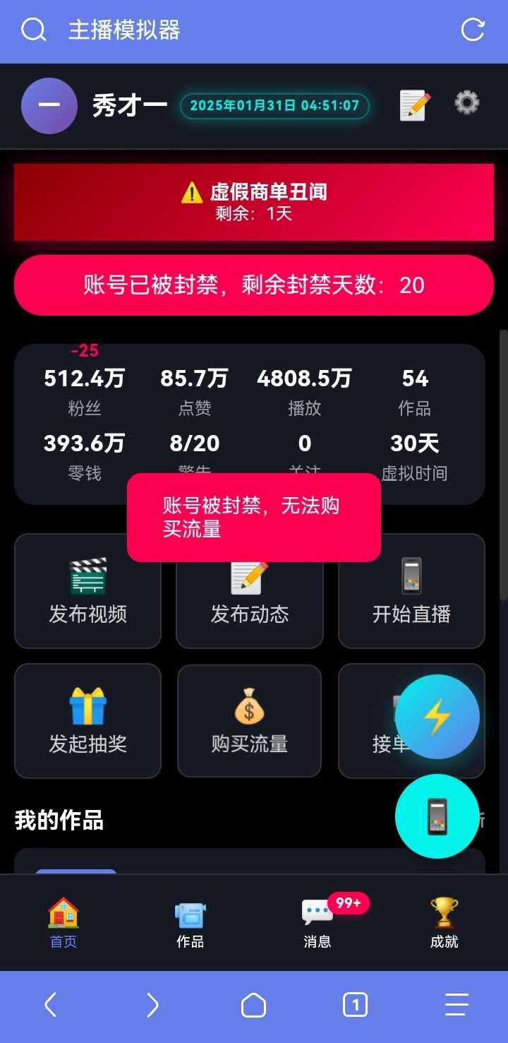 ✨更新内容: 1.优化了评论区的问题 2.修复了评论排序不排序评论的问题 3.现在被封禁后不能再发起抽奖和购买流量及参与热搜话题 4.新加mod功能 5.修复了系统消息每月底结算的问题 6.抽奖活动结束后的掉粉范围改为1-500 在线游玩:https://liveforl.github.io/zb/index