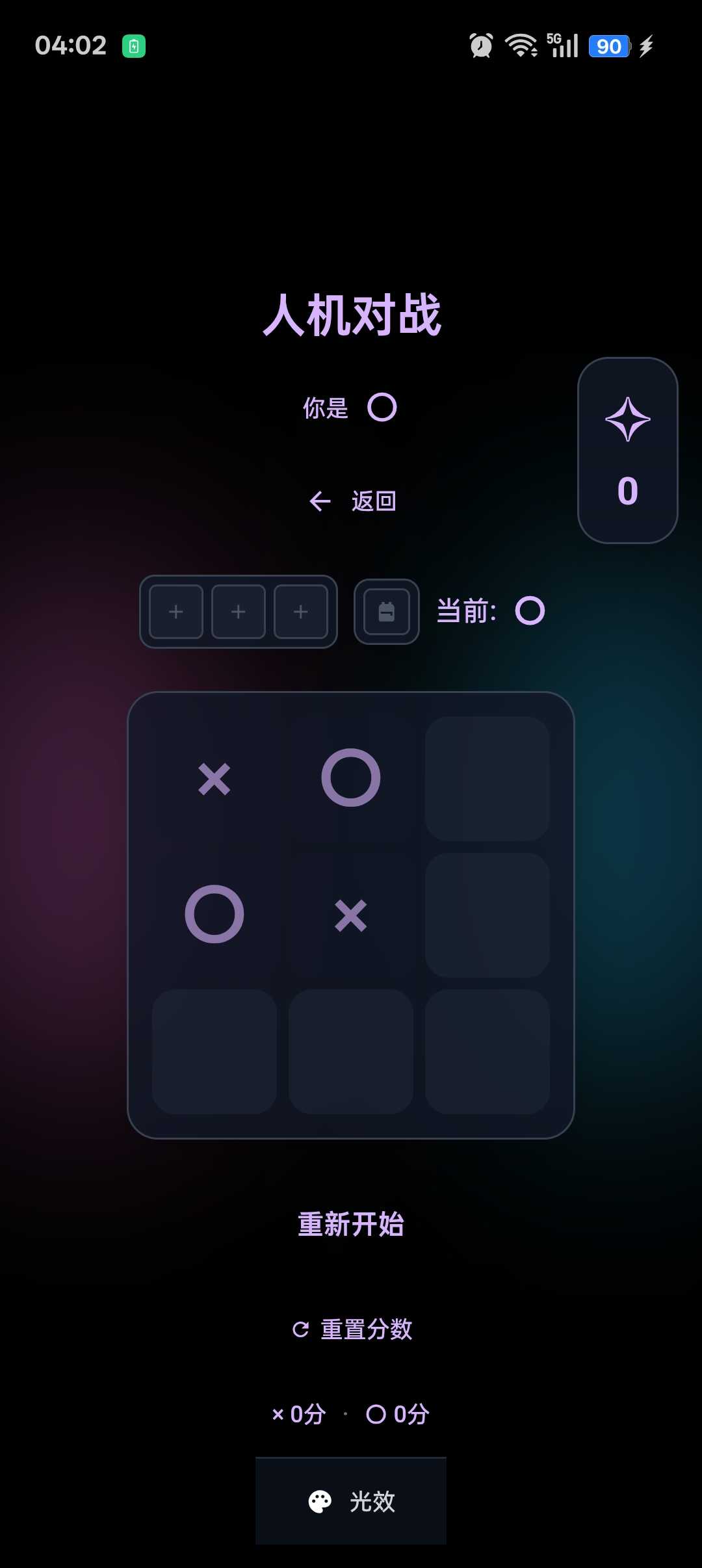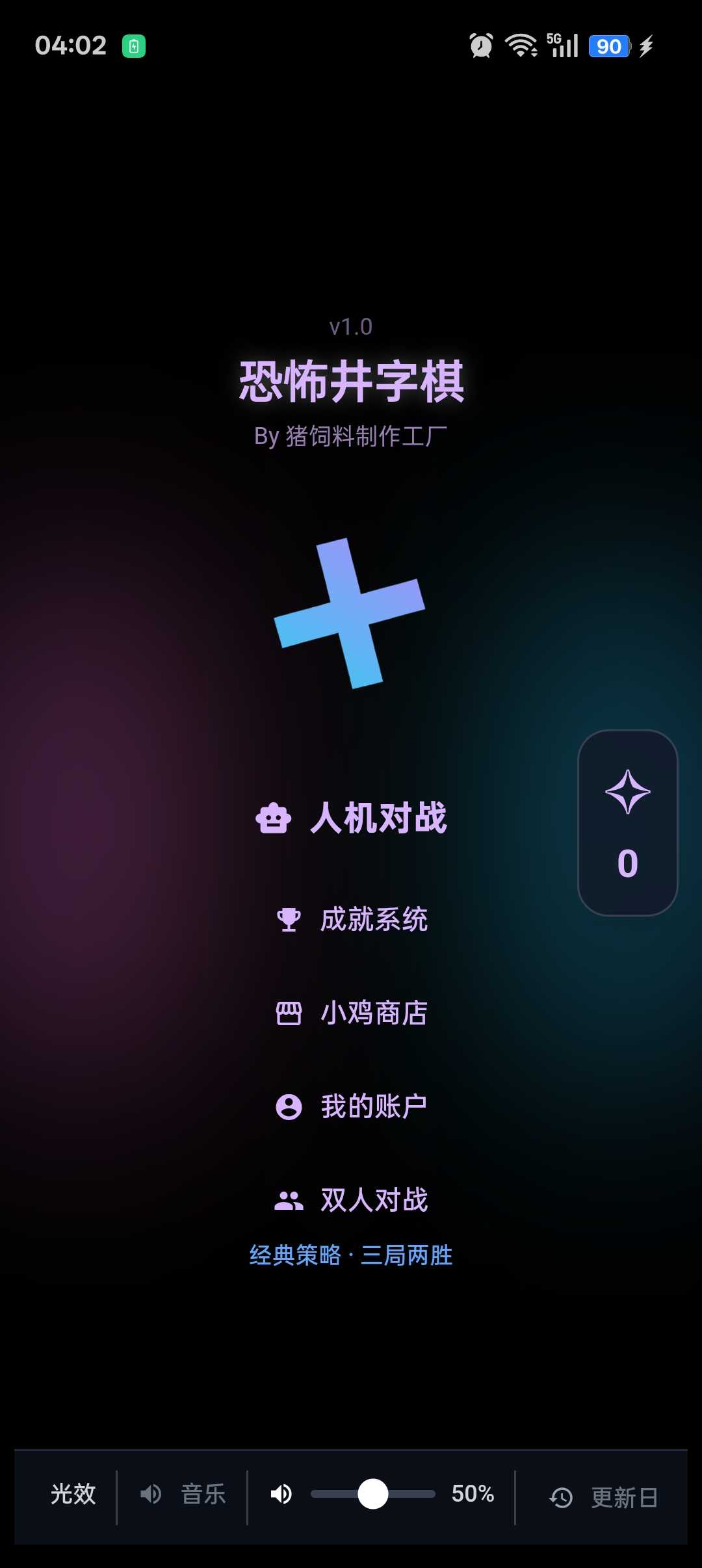 井字棋决斗1.0版本 因为我导出的时候忘记音效音乐了,所以一整个游戏都没有声音,2.0版本会修的 玩法主要分双人对战和人机对战,暂无联机;人机对战氛围5种难度,简单,普通,困难,魔王,新手教程(新手教程指新手难度)出了新手教程外其他难度每获胜可根据难度增加星星数量,星星可以去商店买东西 感谢支持,有bug说