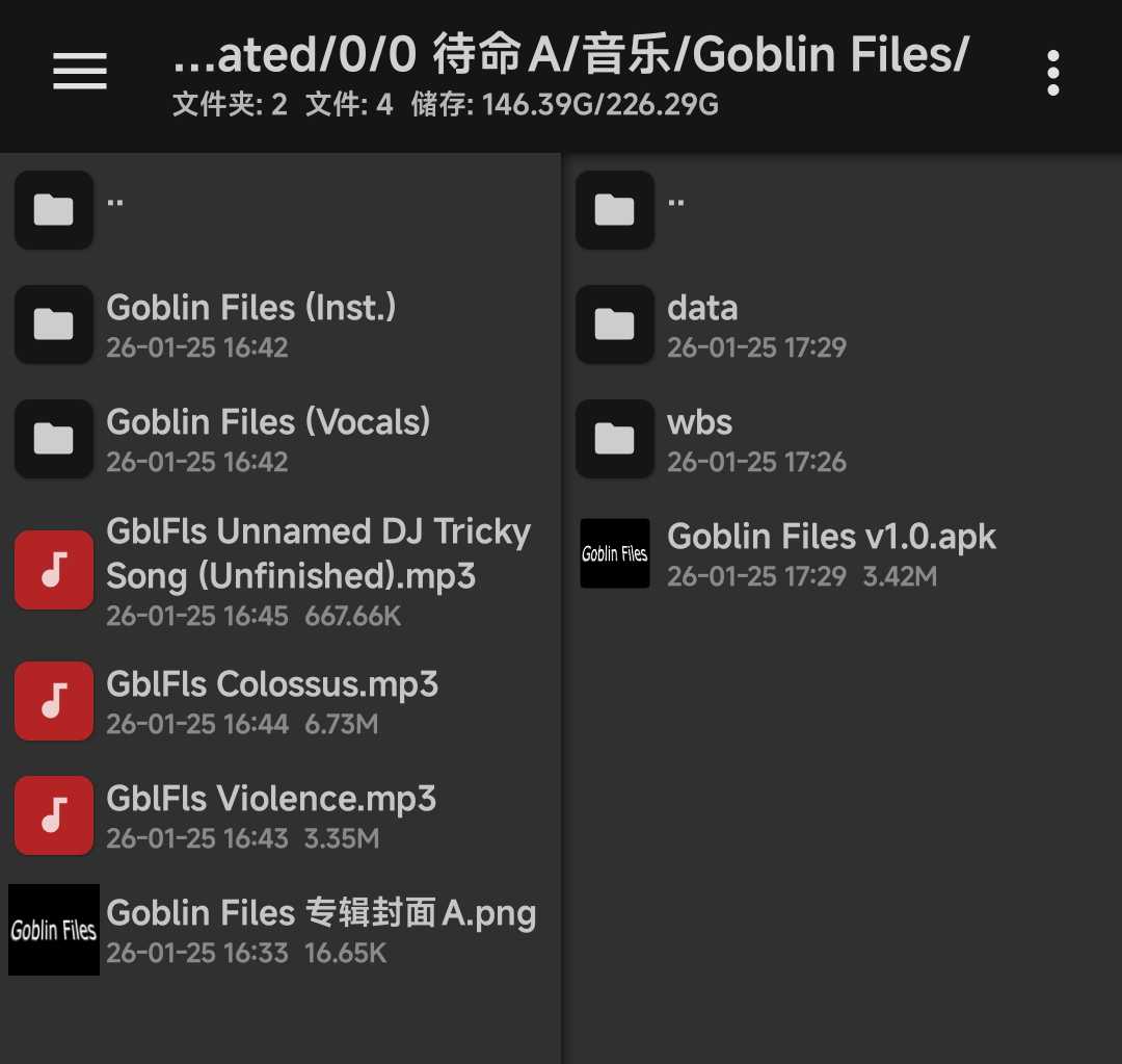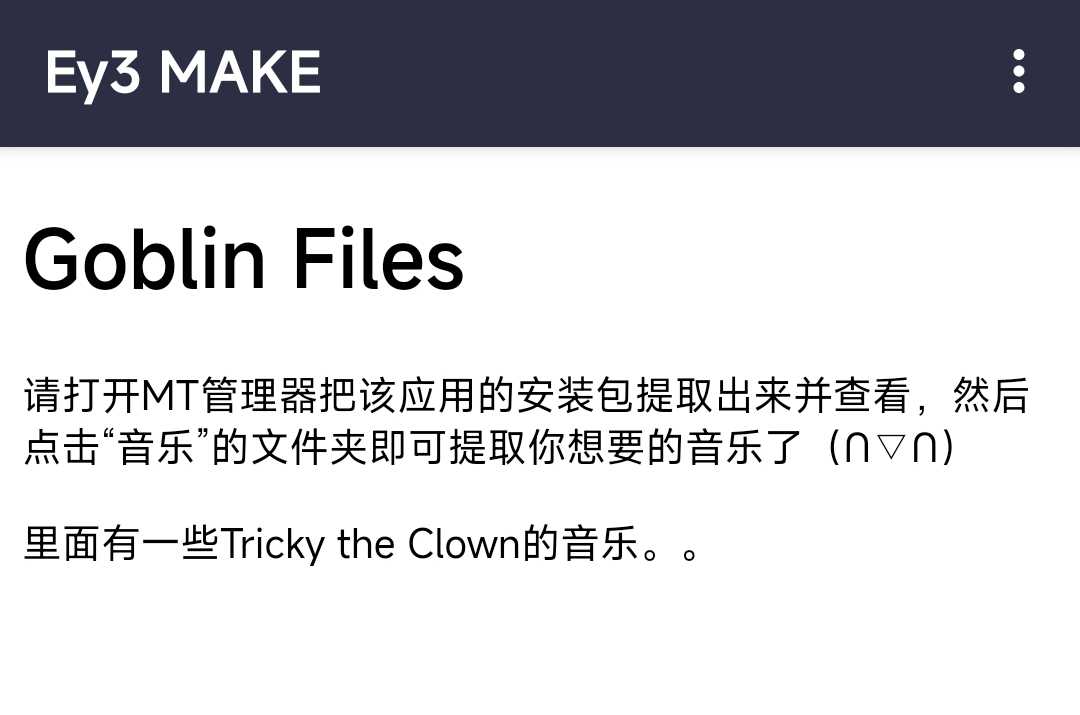Goblin Files 里面有一些关于Vs.Tricky的音乐 下载安装后用 MT管理器 提取安装包后查看,音乐就在“音乐”文件夹里(∩▽∩) 已补充音乐封面、专辑、作者( ̄▽ ̄)~*