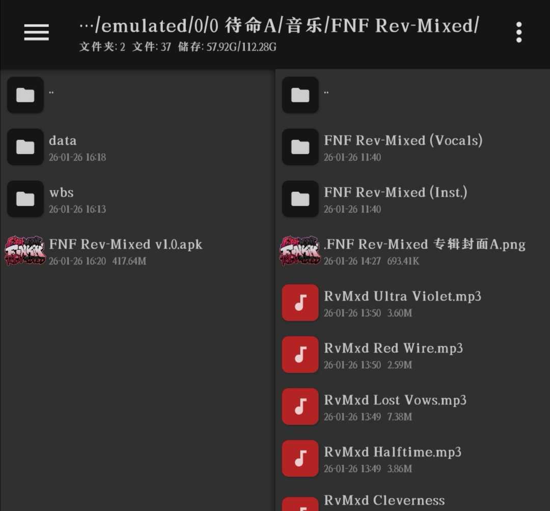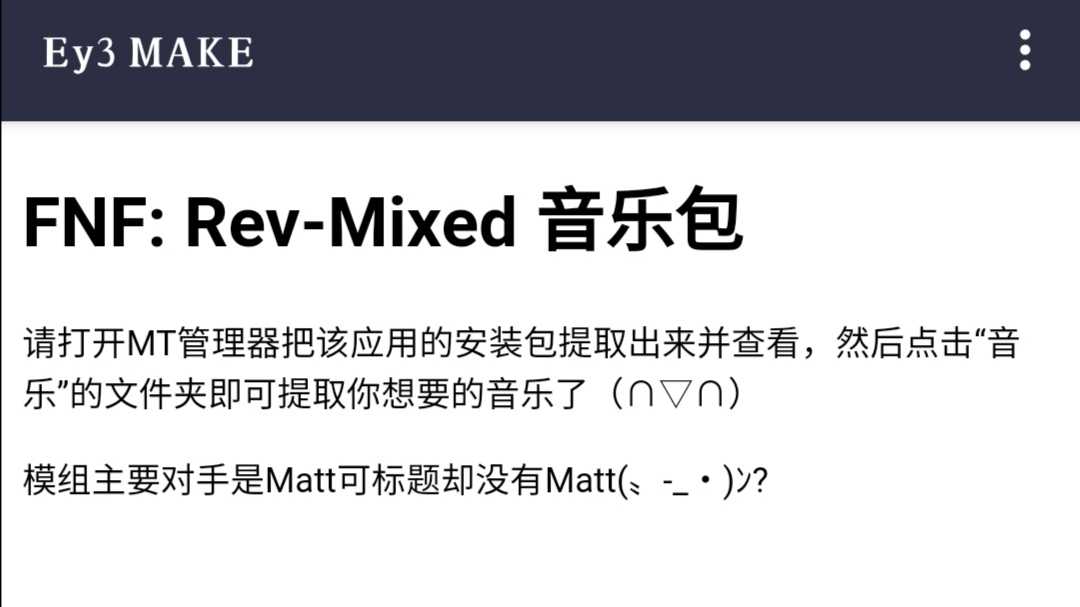 FNF: Rev-Mixed 主要对手是Matt,Wiki标题却没有Matt(≖_≖ |||) 应用名称限制在15字内,只能这样描述模组了(;一_一) 下载安装后用MT管理器提取安装包后查看,音乐就在“音乐”文件夹里(∩▽∩) 已补充音乐封面、专辑、作者( ̄▽ ̄)〜