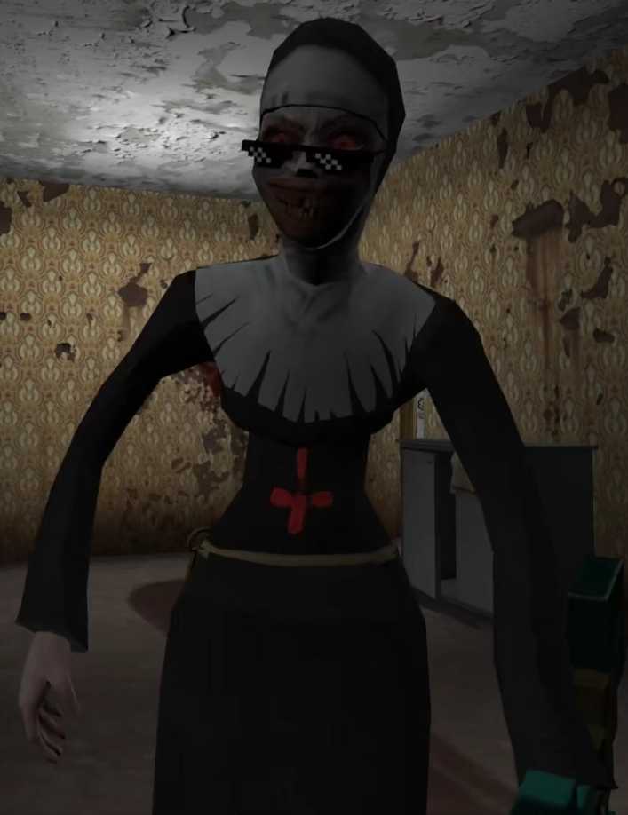 带着像素墨镜,手提mc钻石剑,跑得飞快的The Nun,音乐大改,音效比较搞笑,The Nun打你的时候不再是那惊悚的惨叫声,而是非常搞笑的声音