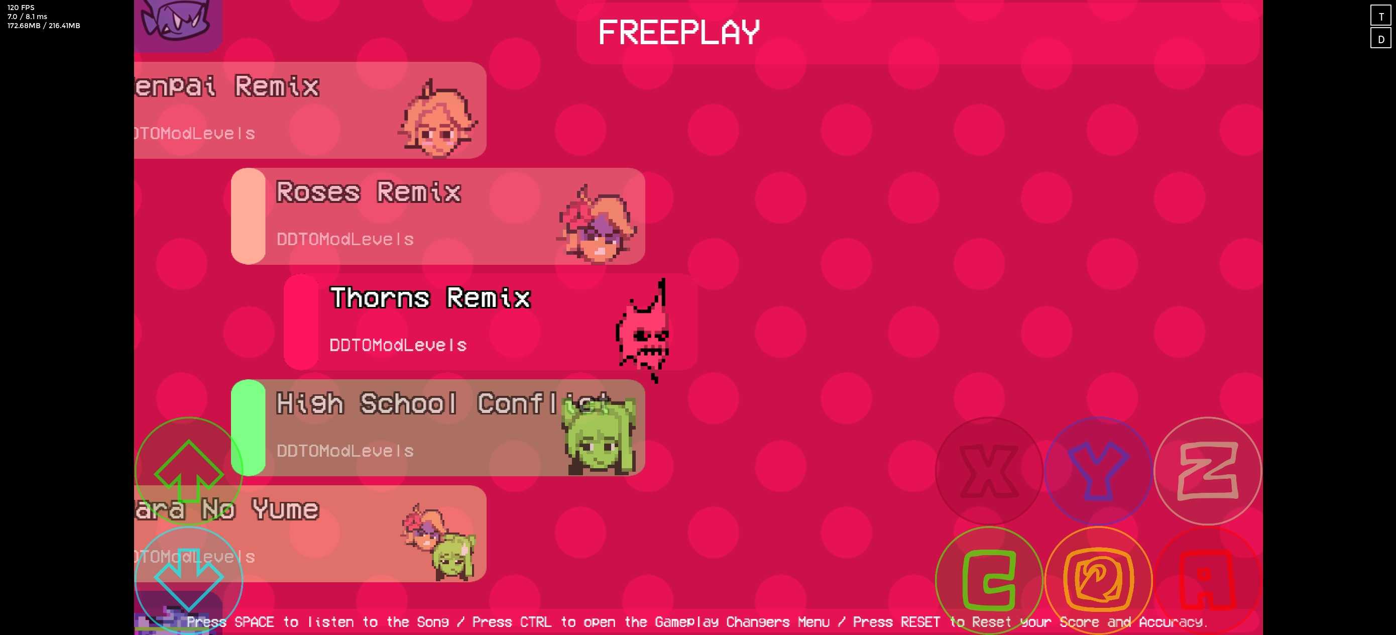 Plus引擎1.2,现在这个引擎是最新版,我是真没招了,0.7.3和0.6.3都玩不了这个模组只有plus才能玩,还有我之前发的那些0.7.3/0.6.3的模组都可以适配plus引擎,主要是plus引擎刚下的时候箭头判定我真想骂人,现在说下这个模组,安装完引擎后,把安装包里面的.plusEngine解压到根目录就ok,想叠模组的话,模组原件在mods文件夹里,里面的曲子很多,包括一些自由换皮的曲子