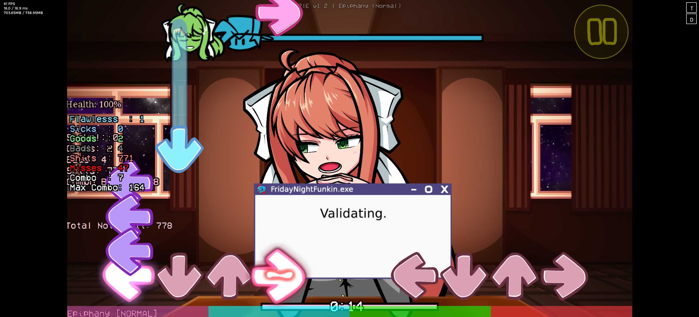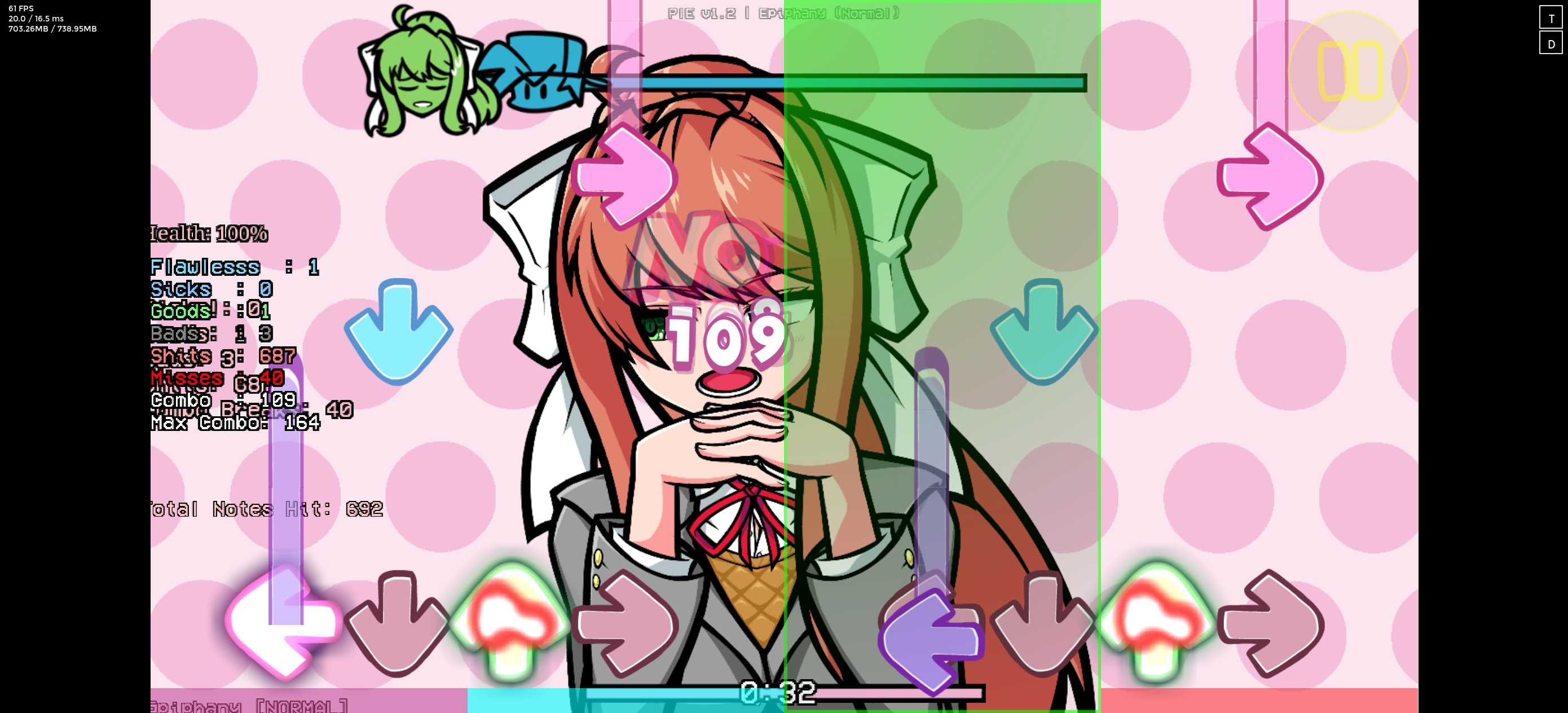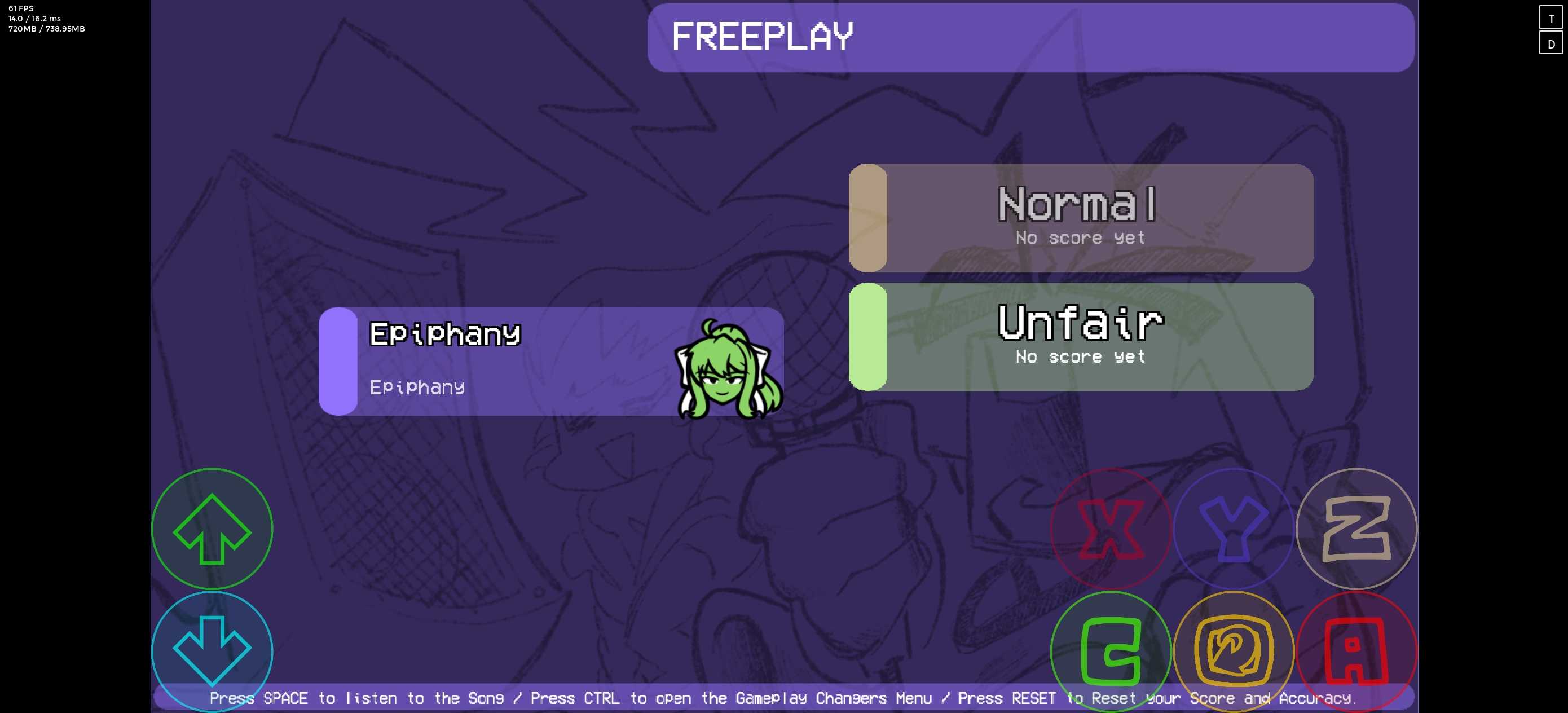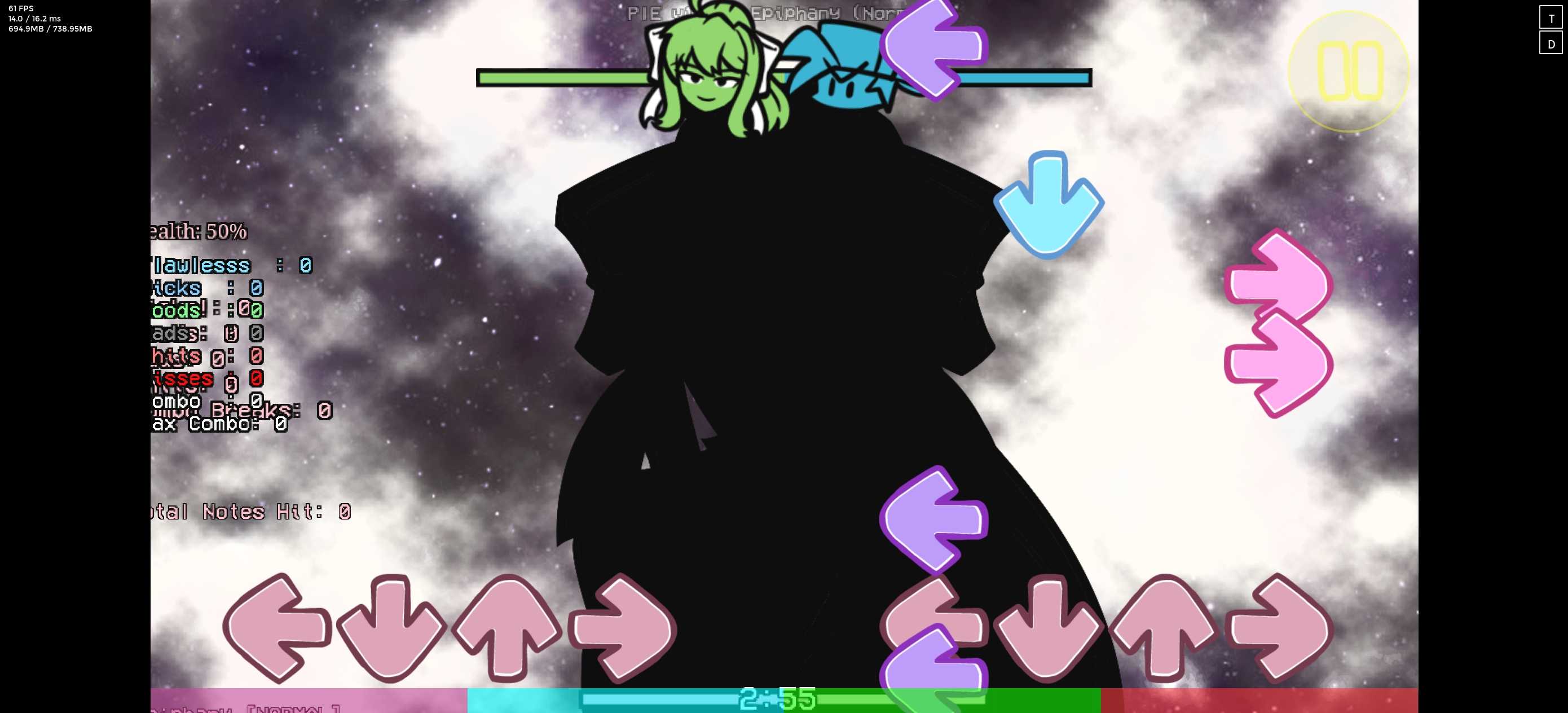 Plus引擎1.2,比原版的顿悟更加难,有两种难度,正常模式没有死亡箭头,另一个有全是死亡箭头,曲子很长,只是左边的精准度和原版重叠了不影响歌曲运行