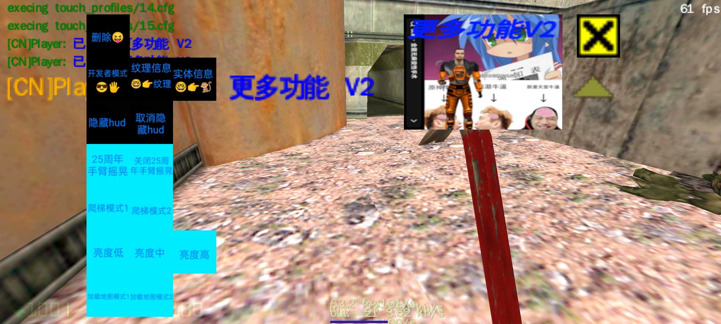 [CN]SR(Yurci·SR)制作,允许转载,请标清原作者 半条命安卓版,使用Xash3D FWGS (Test)0.21 附带大量皮肤、[CN]SR的自制按键、作弊器(作弊器3号没什么用处) 可以自定义喷漆 点击右.上角白色*可以开启观看模式,再次点击黑色×可以恢复,如果按键变回原版,可以在按键设置里面找到wodeanjiannew启用 可以游玩上行链路战役,在新游戏里面勾选Half-Life:uplink即可 若無法正常安裝請看安裝教程 https://b23.tv/6rjBoEd 制作人名单 [CN]SR、Xse54(b站依零小叶子)、牢谢不屑、星辰大海呀_kv、茶茶叶子、why so seroius? 、小乖、不知道在燃什么 测试人员名单 xinhe、牢谢不屑、亿叠凉蓆、星辰大海呀_kv、呱呱 、小乖 、不知道在燃什么、社死你、猎头蟹、跪下了吧 更新日志 (26年1月17日更新日誌見半條命新版安裝器part19) 19.2026年1月17日 新增了网络测试版的gman和狗眼(有概率使用特殊的闲置动作) 新增了alpha動作的士兵 重新將附加內容改為custom文件夾 將*箭和**炮改為alpha版模型(帶有拖尾效果) 更新了牢謝不屑製作的更多功能V2 為更多功能菜單添加了文字提示 修改了黑衣人生成菜單,并添加了更多士兵生成功能 20.2026年1月24日 修改了士兵換彈音效 新增了更明顯的准星(缺點是glock的圖標多出來了*音器) 大幅度的壓縮了遊戲內的圖片,并刪除了歷史遺留的無用圖片 修复了历史遗留的更多功能贴图错误 新增了十幾個皮膚 新增了七首歌 21.2026年1月30日 修改了[CN] SR's team全家福 新增兩張地圖 新增一個簡易選單(放在二號選單內) 新增zoom鍵和sprint鍵(放大鍵和奔跑鍵) 修改了製作人員名單 22.2026年2月1日 允許了連接了公網的玩家主動開服 微改了左輪手槍、十字*、RPG、膠子槍、蜂巢槍、手榴*、遙控炸*的模型 為RPG、手榴*、遙控炸*添加了音效 修復了人類士兵的腳步聲 添加了部分來自斯文合作5的音效 更新了更多功能V2 修復了上行鏈路配音 新增了沒有武器模型的異形士兵和蟲族士兵生成器