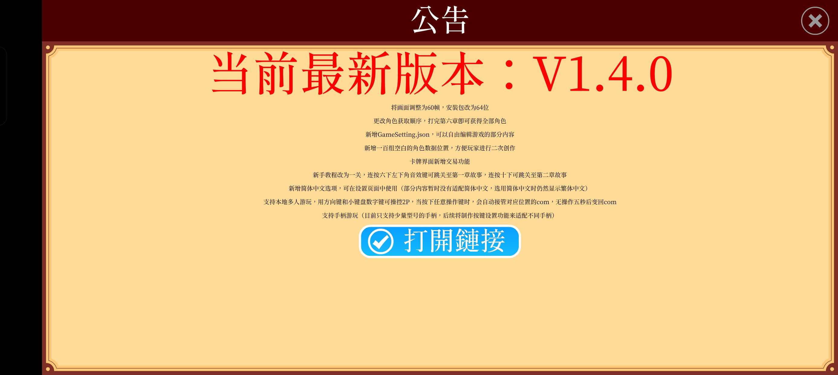 重大更新: 安装包32位改为64位,原先不适配32位的手机终于能正常游玩了 游戏帧率提升至60,体验更加流畅 角色获得顺序调整以及具体其他更新内容请看图
