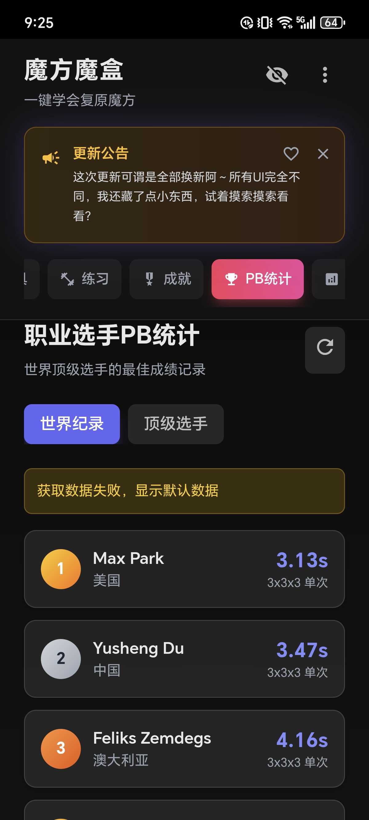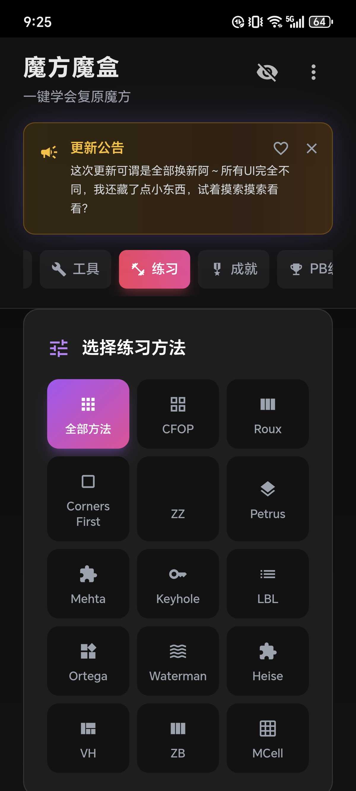 魔方魔盒 一个单人独立制作的小众魔方教程软件,里面的内容各式各样,你想学的都有,不过要有要有少许的魔方理解,不然可能看不懂。 目前软件打开软件时必须使用网络,当出现开屏动画就可以关闭了 还有就是,软件打开时无法自动全屏,需要前往设置,找到顶部隐藏,或者不显示顶部,来达到全屏效果。 软件内部的PB 速拧方式统计 共识 等 ,暂时无法联网(不知道什么问题)