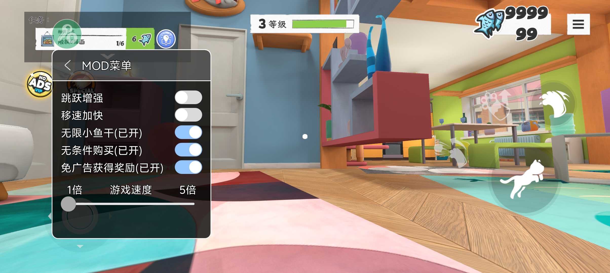 这款应用他有绿钥匙菜单可以无限条件购买和免广告和无限小鱼干儿,非常的好玩