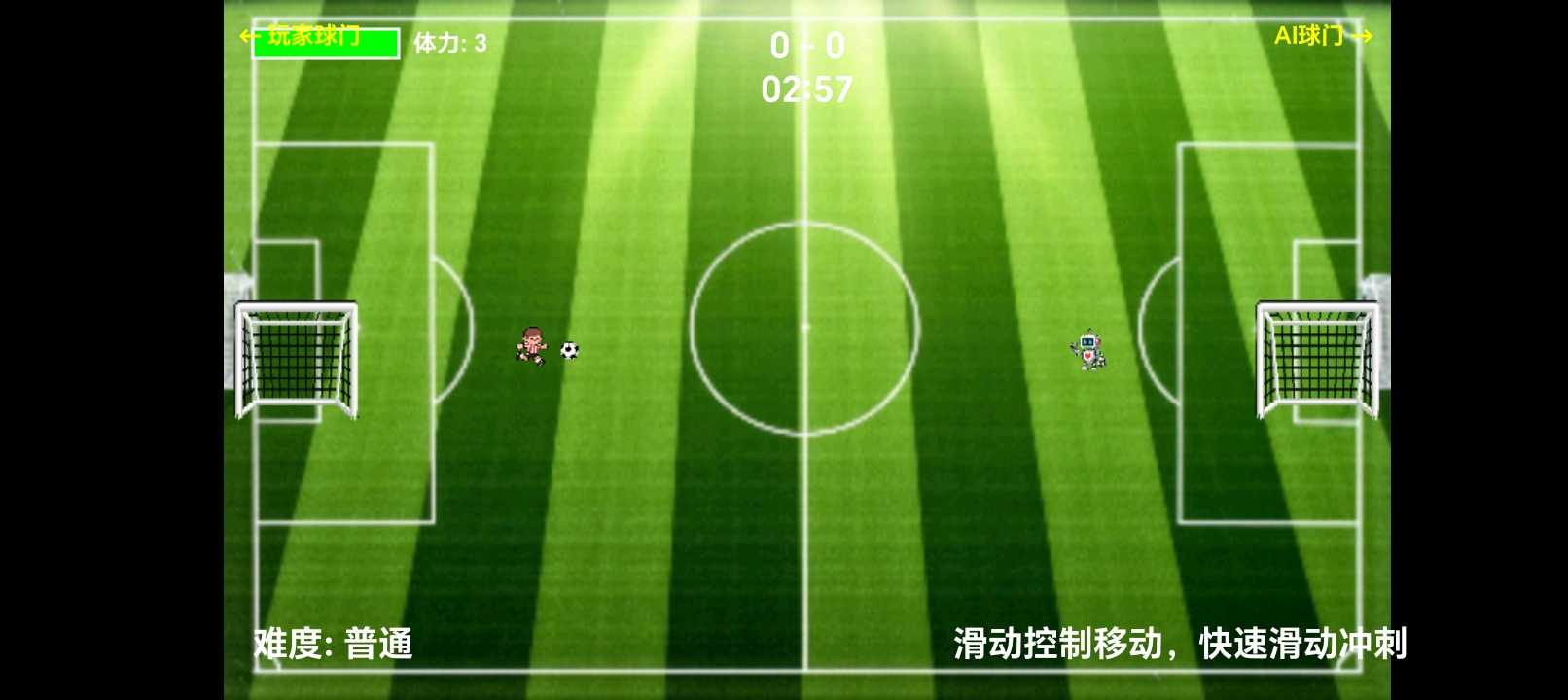 《像素足球对决》是一款由我自制的俯视角休闲足球游戏。滑动屏幕控制球员移动,快速滑动触发冲刺,与AI展开对决。巧妙预判足球轨迹,将球射入对方球门即可得分! 有问题可以反馈,感谢支持!