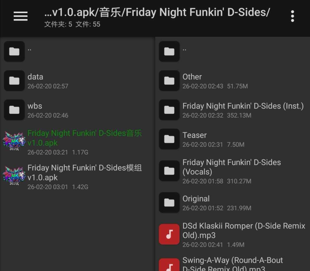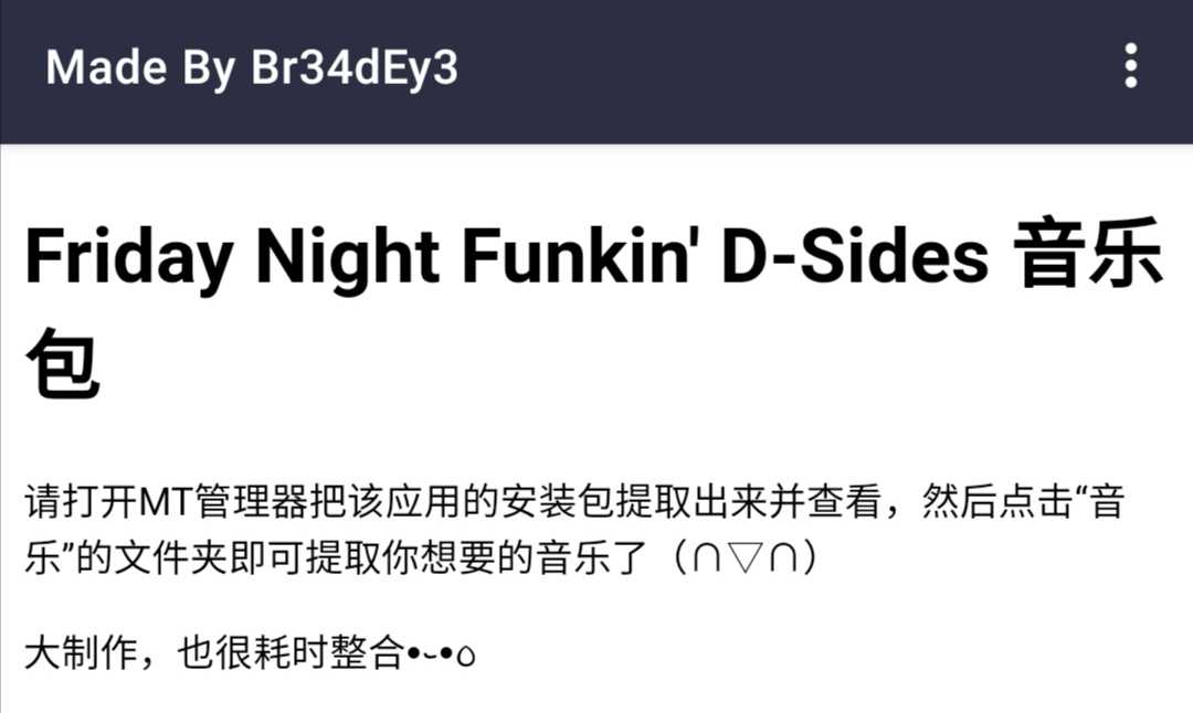 Friday Night Funkin' D-Sides 音乐包 呼,用了我三天时间整理,不过祝贺大家新年好*(^o^)/* 请打开MT管理器把该应用的安装包提取出来并查看,然后点击“音乐”的文件夹即可提取你想要的音乐了(∩▽∩) 已补充音乐封面、专辑、作者( ̄▽ ̄)〜