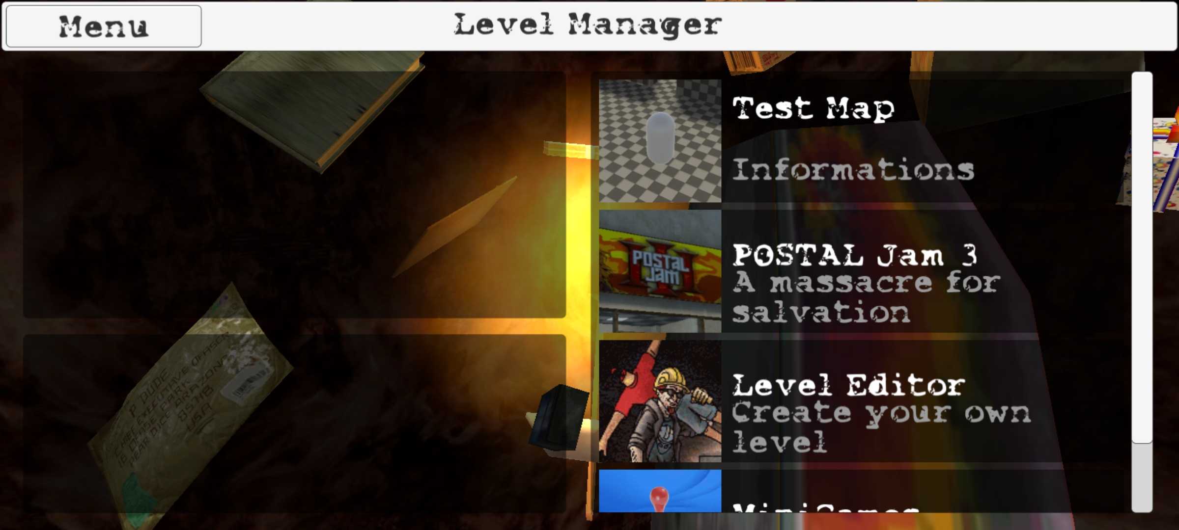 在itch上找到的夺命邮差同人游戏,以下为关卡翻译,图片中展示的是第2关 1.测试地图 这游戏模式就是个未完成的大地图,没有武器可以进去闲逛 2.夺命大解救 商场里出现了****你能否从他们手上解救出人质?该模式武器需要自己拿,分别在出生点的车旁边,刚进商场左转的小当铺内 3.自制地图 这个不用我多说了吧,不过怎么自制我还没搞懂 4.小游戏 里面有扑克比大小和***