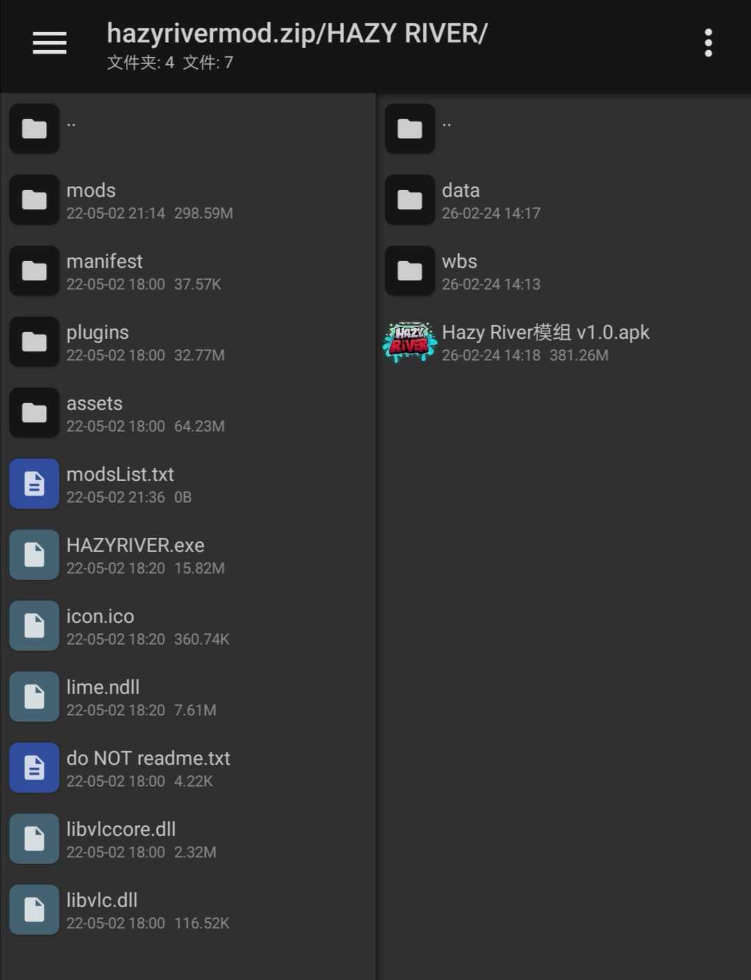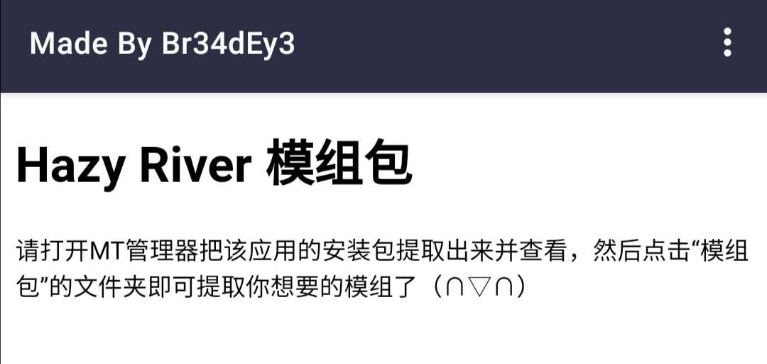Hazy River 模组包 下载安装后用MT管理器提取安装包后查看,模组就在“模组包”文件夹里(∩▽∩) 模组为原下载地址下载的原包,应该不能直接装手机上(´⊙ω⊙;)