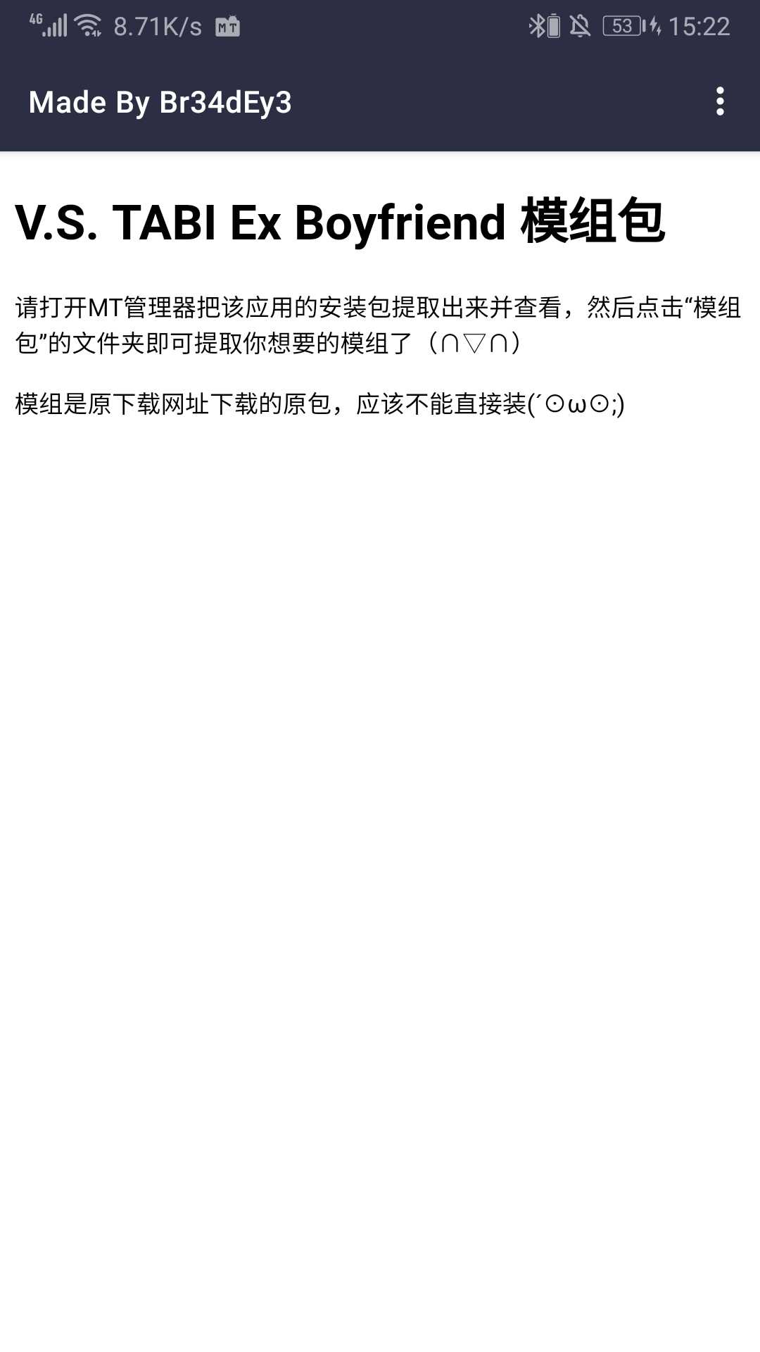 V.S. TABI Ex Boyfriend 模组包 只有Redux的 下载安装后用MT管理器提取安装包后查看,模组就在“模组包”文件夹里(∩▽∩) 模组是原下载地址下载的原包,应该不能直接装(´⊙ω⊙;)