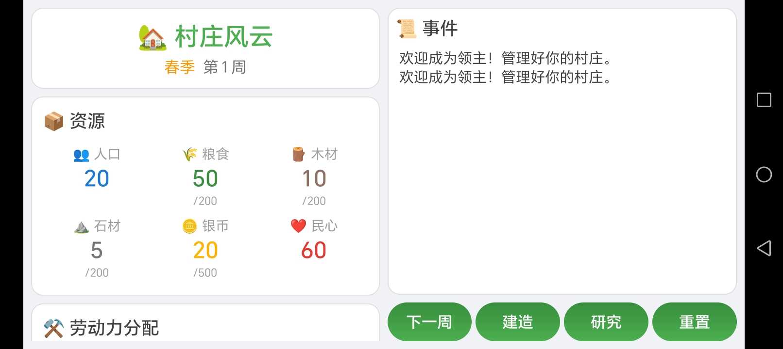 欢迎来到《村庄风云》,一款充满策略与温情的模拟经营游戏!你将扮演一位初出茅庐的领主,从一座小村庄开始,带领村民在这片富饶的土地上繁衍生息。 核心玩法 · 资源管理:合理分配粮食、木材、石材、银币,确保村庄的生存与发展。 · 劳动力分配:自由调配村民从事农耕、伐木、采矿,提升生产效率。 · 季节更迭:春夏秋冬影响资源产出,考验你的应变策略。 · 建筑升级:建造粮仓、水井、酒馆、教堂等特色建筑,解锁特殊效果。 · 科技研究:投入银币研发农业、采矿、伐木技术,让你的村庄蒸蒸日上。 · 随机事件:丰收、强盗、疾病、移民……每一次选择都将影响民心与人口。 游戏特色 · 深度策略玩法,每一次决策都至关重要。 · 无网络、无广告,随时随地畅享纯粹经营乐趣。 现在就下载《村庄风云》,打造属于你的传奇村庄吧!