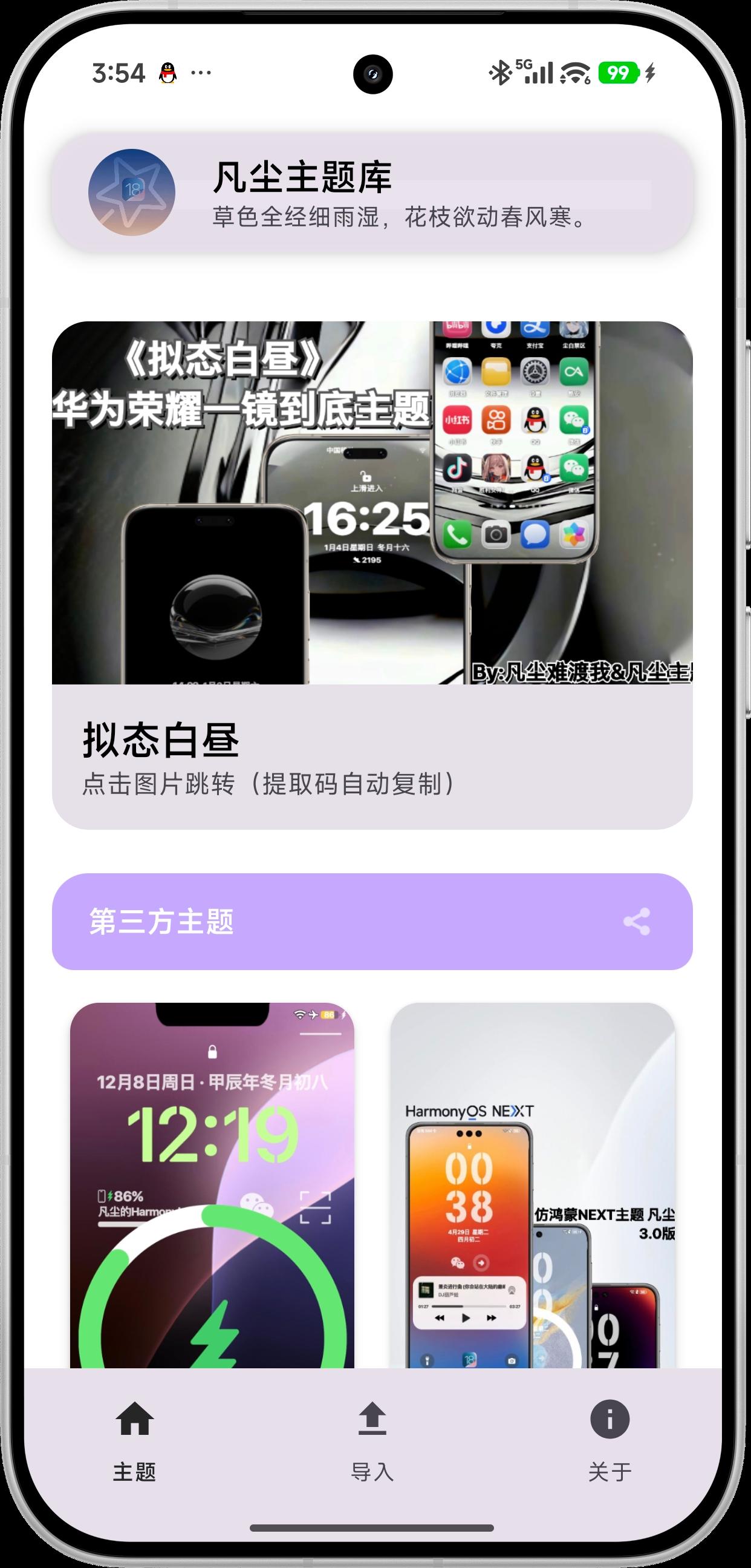 一个免费无广的HUAWEI or HONOR第三方主题平台 本次更新与旧版共存 更新内容:重构项目,更换编程语言,带来更流畅、简洁的UI 为了弥补之前一键导入功能一直没有用的遗憾,新增主题导入工具 新增链接跳转提醒,如上图 目前没有实现的功能:小工具页面(太多了我懒得做?!)