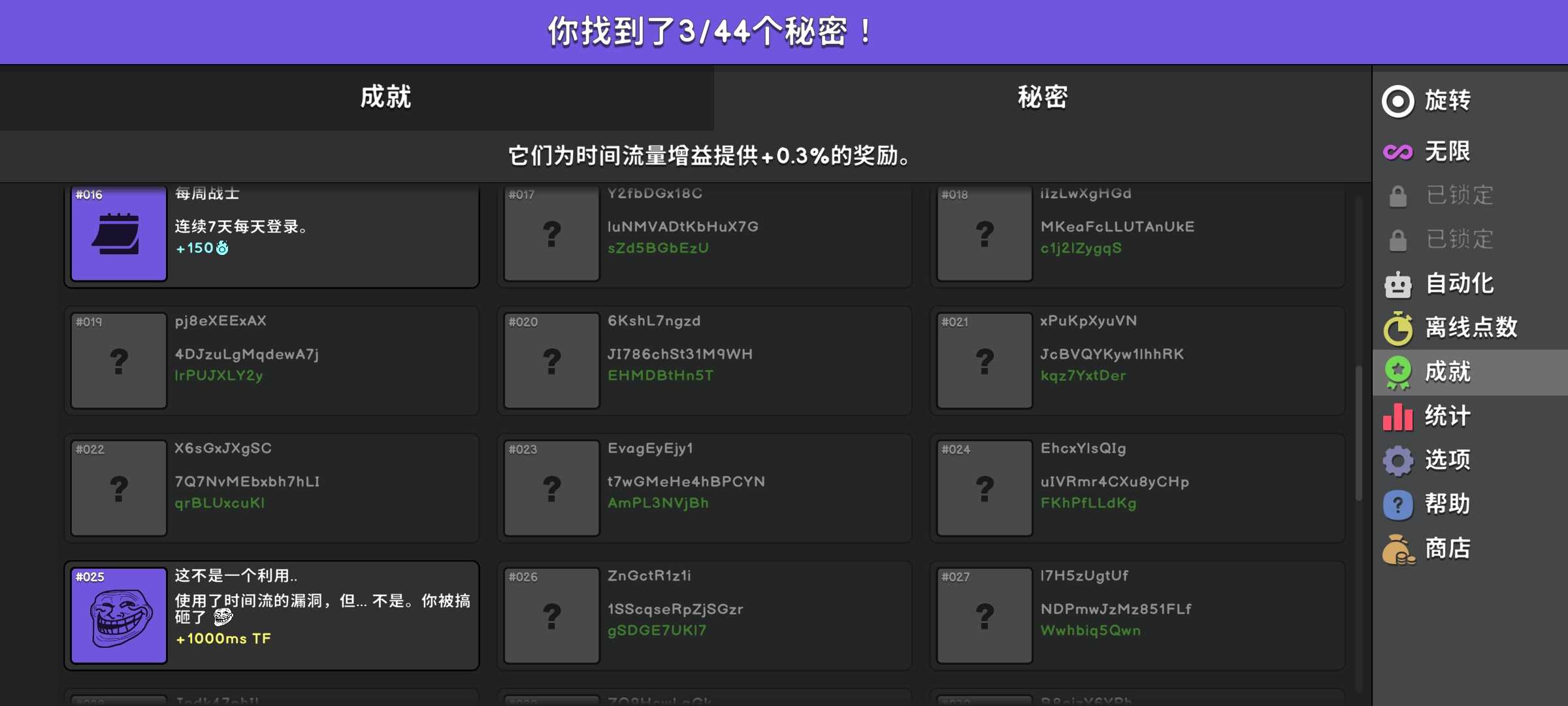 增量类型啊成就的话简单就是隐秘,我直接锁两个一个是时间的把戏,一个是你当这是饼干吗?没错,这就是饼干,点击100次中新泾红点和时间流量那里,点击打开,关掉打开,打开关掉能决定是横屏或者竖屏那什么,我不是创作者游戏内充值QQ号那里才是原创者,我只是搬运的,看这里没有所以嗯,对没错求放过