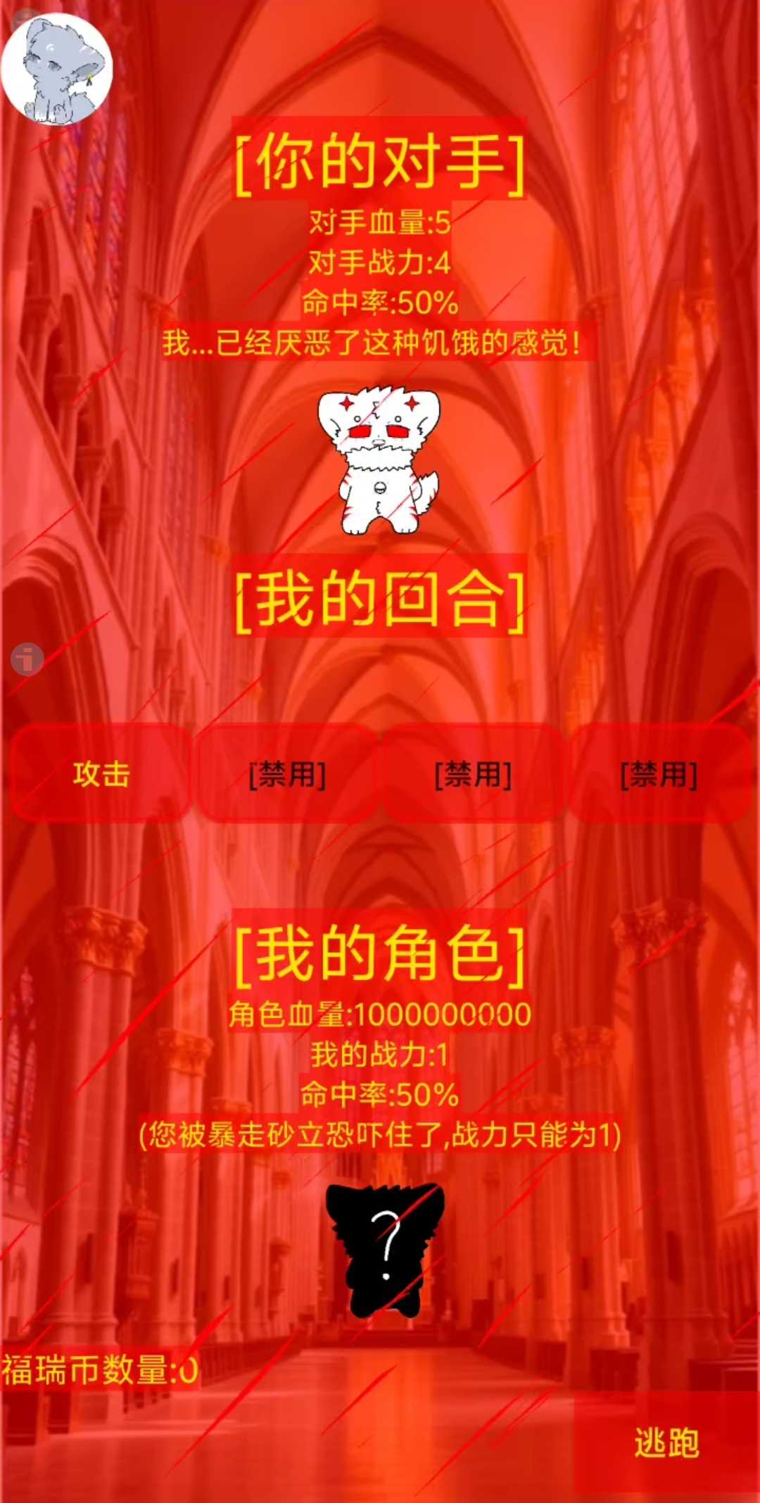 [游戏介绍]:这是一款回合制角色扮演赌命游戏,一个靠运气、血量、装备、战力战胜对手赢得奖励的回合制游戏,玩家不仅需要在战斗中靠运气躲避对手的攻击,也要靠丰富的战斗资质战胜对手赢得奖励...... [更新内容] 版本6.99更新内容介绍 修复部分地图无法进入bug,新增地图(冰天雪地),新的挑战对手,冰雨(一共有三个阶段),新的战斗机制[冻结]:改变回合,设置战斗结算后的福瑞币奖励为随机,关数越高随机奖励数越高,奖励对手战力难度,设置对手初始血量与我的兽设角色血量同步,优化新地图战斗界面,签到奖励调整 版本6.66更新介绍 新增挑战角色矇和专属bgm(矇一共有三个阶段可供挑战),新增矇的对话内容每个阶段都有不同的对话内容,优化挑战机制,新增矇的挑战机制[强化],更改砂立二阶为猩红教堂的最后一位boss,增加了商店、武器图鉴、装备图鉴的背景图和按钮文字颜色,使界面看起来更加地缤纷色彩,修复已知的对战bug 游戏版本更新6.33内容 每日签到奖励设置为随机5到30的福瑞币奖励,快来试试你的运气吧! 新增第二期的四个角色内容(岑崟,小虎,超能k9,暴走砂立(一阶),获取方式:抽奖碎片兑换 暴走砂立(一阶)角色特殊机制:出战时命中率100% 游戏版本3.99更新内容 新增两件护身符装备和装备图鉴,护身符可在装备图鉴里查看,佩戴时可永久增加血量上限,①护身符:玉(装备时可永久增加1点血量)②护身符:绯(装备时可永久增加2点血量) 获取方式:商店购买,修改了练习模式里训练人偶的血量和攻击力 版本3.69更新内容 新增猩红教堂地图,新的挑战角色boss:暴走砂立二阶和专属战斗bgm,新的对话内容和boss攻击机制, 增加了二阶砂立的地图战斗特效,还有兽设角色信息,在主页点击我的兽设点击对应角色头像即可查看角色对应色信息以及品质评估等... 版本3.33更新内容 新增三款不同的挑战角色(超能k9,dr博士,暴走砂立boss(一阶),三种不同的对话内容,暴走砂立(一阶)拥有特殊挑战限制 版本3.3更新内容:新增三款挑战角色(dr博士,砂立,岑崟)新增练习模式,新的地图(神圣教堂),更新了抽奖界面背景图,增加按钮背景装饰,新增岑崟挑战时的开场白和对话系统,让战不再无聊,增加天选阁和神圣教堂专有bgm
